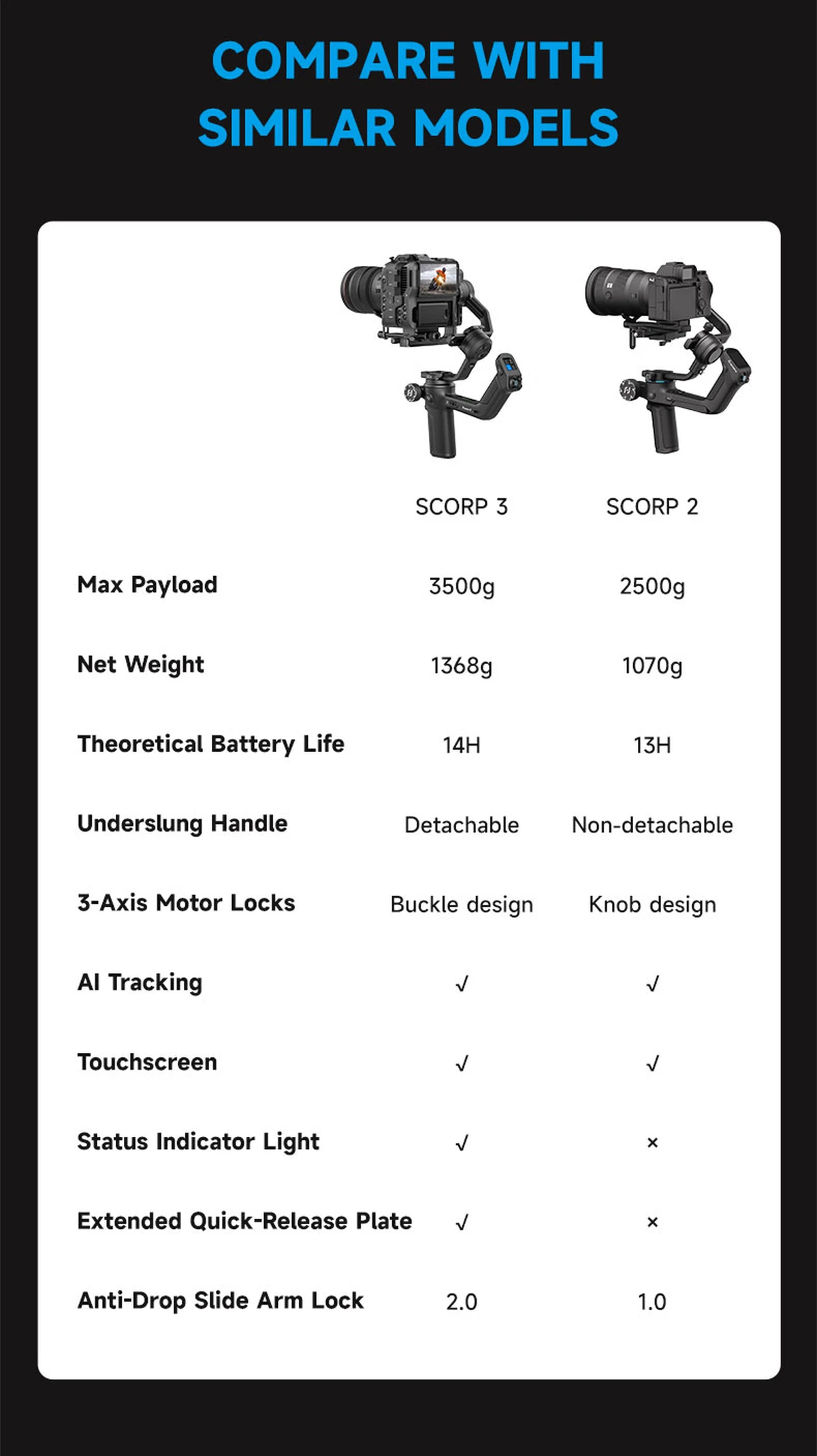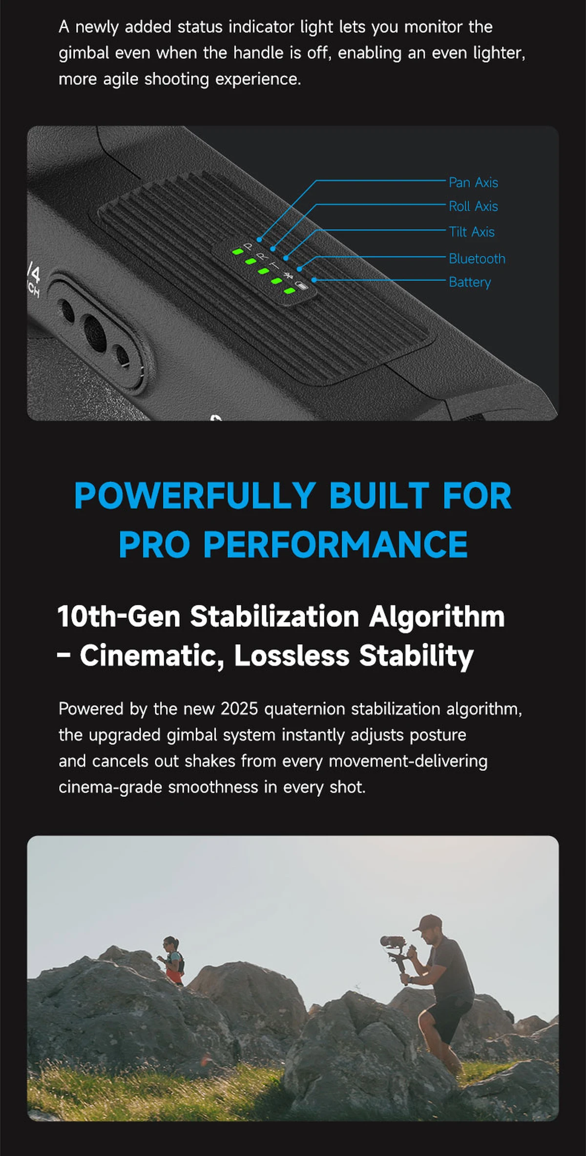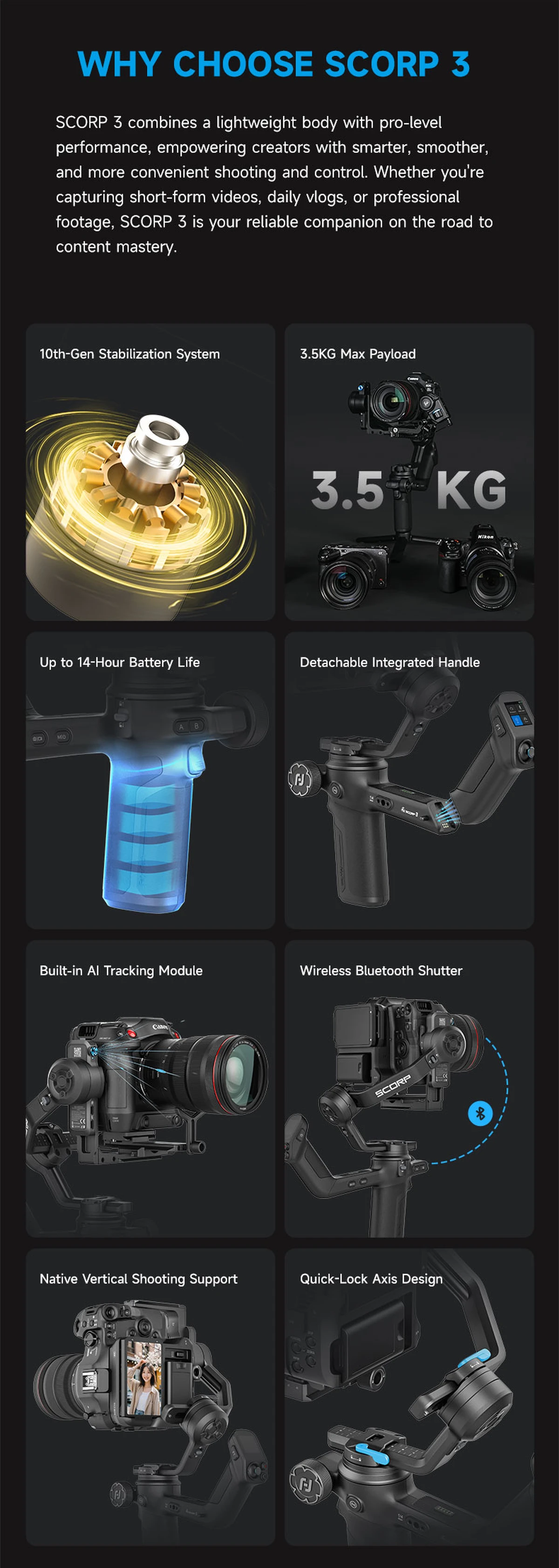 Equipped with the Stabilization 10.0 system, the SCORP 3 features optimized motor control and an advanced algorithm that effectively reduces camera shake and ensures smooth motion.