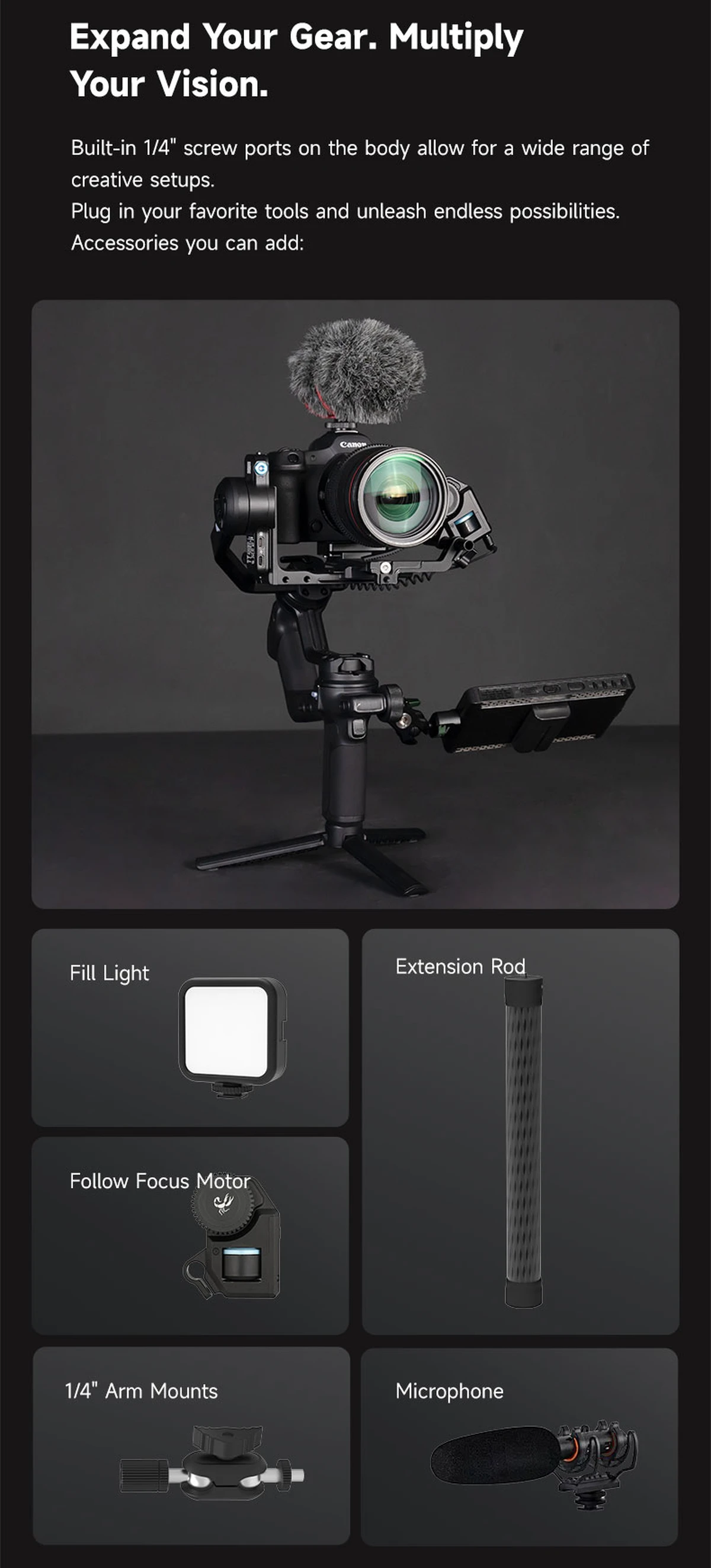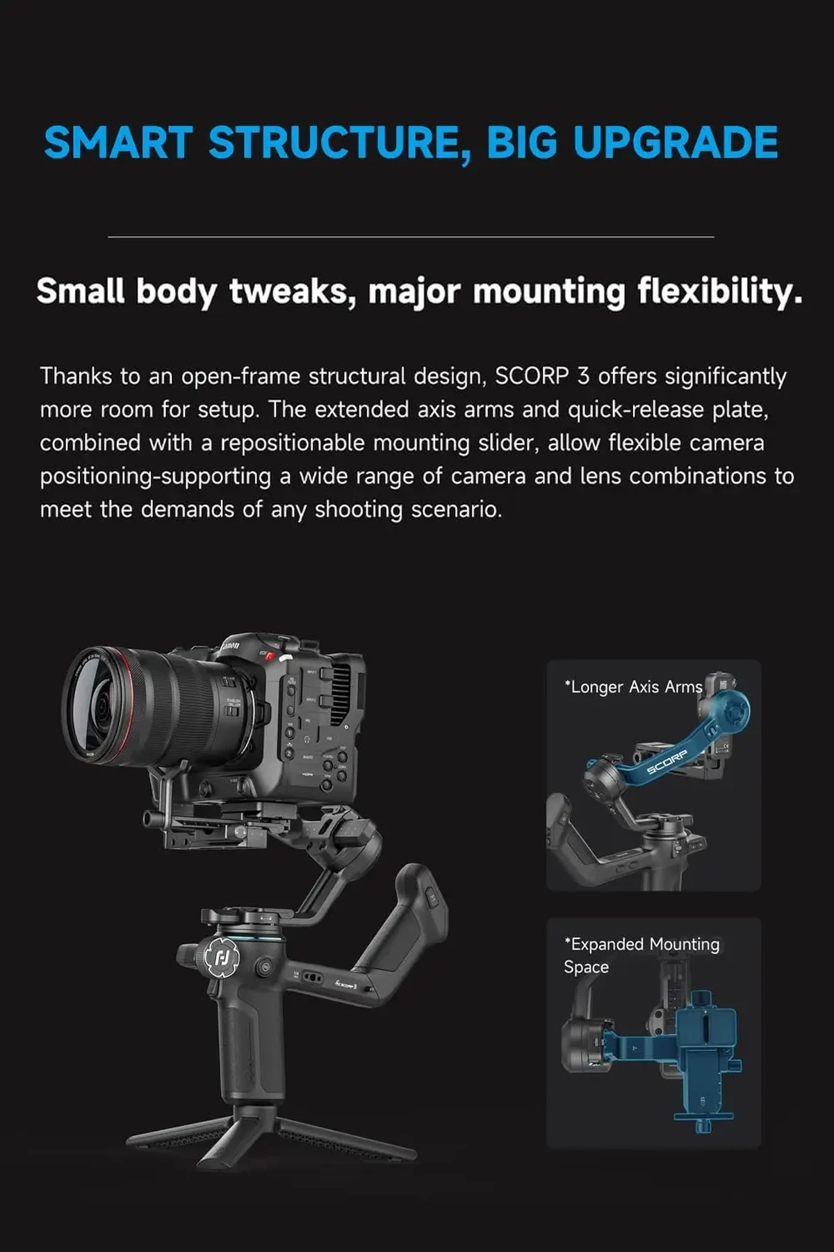 The SCORP 3 is a modern 3-axis gimbal for DSLR and mirrorless cameras. It enables exceptionally smooth, professional video recordings – ideal for filmmakers, vloggers, and content creators. Thanks to its sophisticated design and powerful stabilization technology, the system is suitable for both dynamic movements and precise camera pans.
